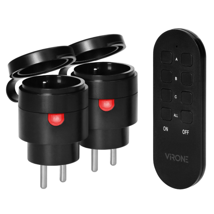 2 Gniazda hermetyczne Virone RS-7 służą do bezprzewodowego sterowania (tj. włączania / wyłączania) urządzeniami elektrycznymi (np. lamp, TV, wentylatorów, klimatyzatorów itp.) za pomocą pilota (nadajnika).
