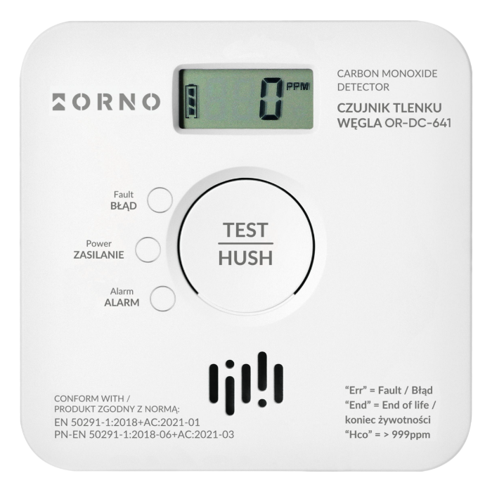 Czujnik tlenku węgla Orno OR-DC-641 pozwala na ciągły monitoring stężenia tlenku węgla CO (czadu) w powietrzu oraz wykrywania i alarmowania o przekroczeniu maksymalnego bezpiecznego stężenia tego gazu. Posiada wysokiej jakości czujnik elektrochemiczny oraz wyświetlacz LCD pokazujący poziom stężenia tlenku węgla w zakresie od 0 do 999 PPM. Przekroczenie dopuszczalnego poziomu CO sygnalizowane jest optycznie oraz akustycznie.