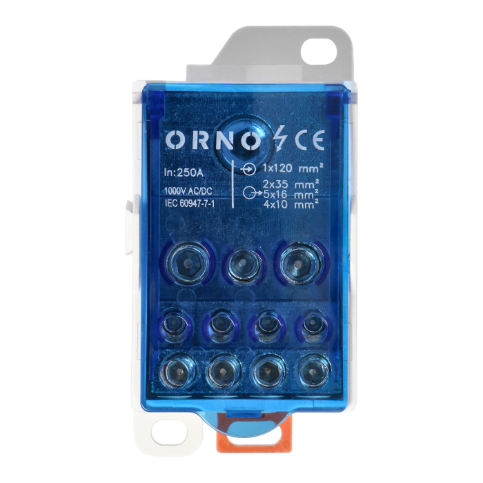 Blok rozdzielczy mocy Orno OR-LZ-8207/250 pozwala na podłączenie kabli o dużym przekroju. Stosuje się go w rozdzielniach elektrycznych i obudowach przemysłowych celem dystrybucji energii. Montuje się go na szynę DIN lub płytę montażową.