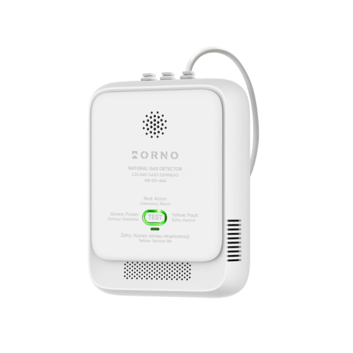 Detektor gazu ziemnego Orno OR-DC-646 służy jest do monitorowania pomieszczeń pod kątem obecności gazu ziemnego (metanu). Posiada powiadomienie optyczne i dźwiękowe oraz przycisk TEST umożliwiający sprawdzenie poprawności działania urządzenia.