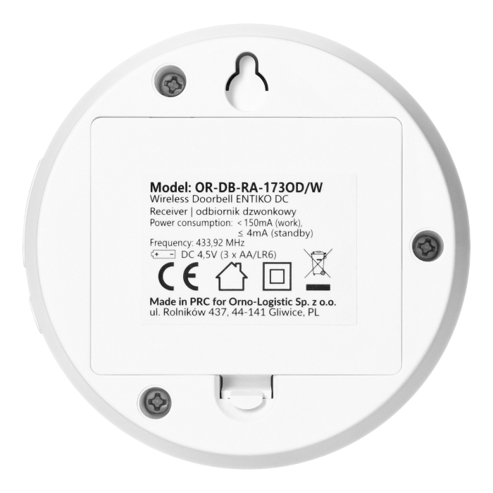 Dzwonek bezprzewodowy Orno ENTIKO DC OR-DB-RA-173/W posiada zasięg do 300 m (w terenie otwartym), dzięki czemu można umieścić nadajnik w znacznej odległości od domu bez ryzyka utraty sygnału.