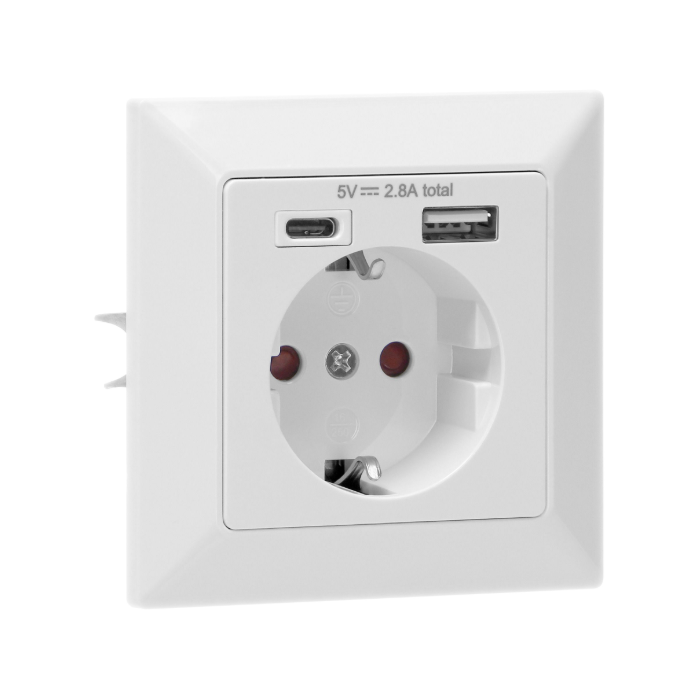 Gniazdo elektryczne 2P+Z (schuko) ORNO OR-AE-13232(GS) posiada 2 porty ładowarki USB (typ A i C), dzięki którym możliwe jest ładowanie większości telefonów, tabletów i urządzeń mobilnych - wymagany kabel USB (brak w zestawie). Montaż urządzenia możliwy jest w standardowej puszce fi 60 mm.