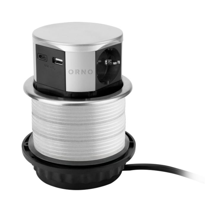 Wysuwane gniazdo meblowe ORNO OR-GM-9049(GS)/G o średnicy 10 cm to praktyczne i eleganckie rozwiązanie do kuchni, biura lub salonu, które umożliwia wygodne korzystanie z zasilania bez zajmowania przestrzeni na blacie.