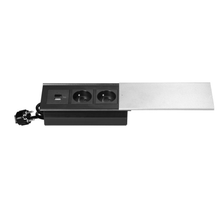 Gniazdo meblowe ORNO OR-GM-9043/G z przesuwną klapką to estetyczne i praktyczne rozwiązanie przeznaczone do montażu w blacie lub biurku, zapewniające łatwy dostęp do zasilania oraz ładowania urządzeń mobilnych.