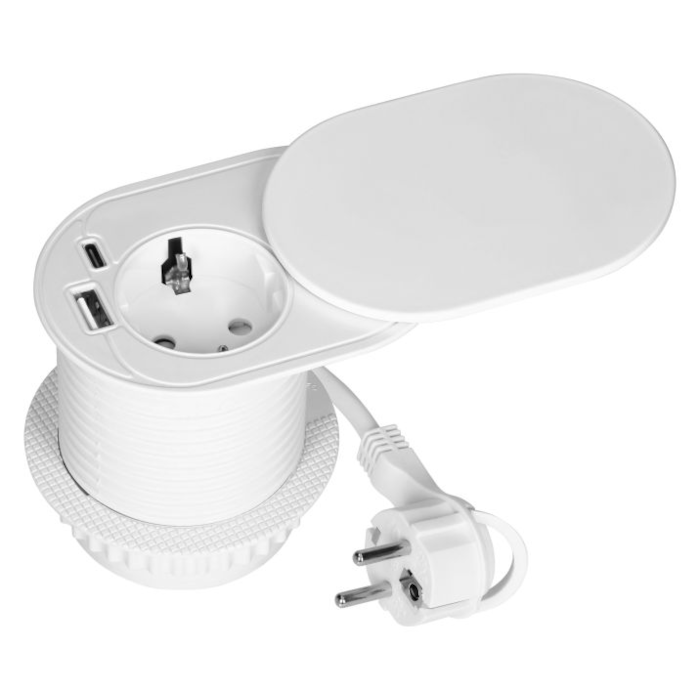 Wpuszczane gniazdo meblowe ORNO OR-GM-9042(GS)/W o średnicy 6 cm z pokrywką to praktyczne i estetyczne rozwiązanie przeznaczone do montażu w blatach w domu lub biurze.