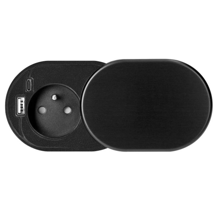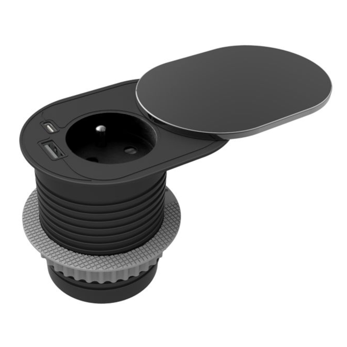 Wpuszczane gniazdo meblowe ORNO OR-GM-9042/B o średnicy 6 cm z pokrywką to praktyczne i estetyczne rozwiązanie przeznaczone do montażu w blatach w domu lub biurze.
