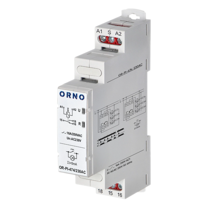 Przekaźnik impulsowy Orno OR-PI-474/230AC umożliwia sterowanie działaniem innego urządzenia. Maksymalna moc obciążeniowa wynosi 4000VA.