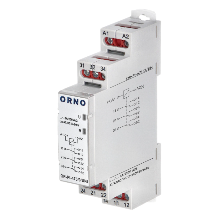 Przekaźnik Orno OR-PI-475/3/UNI umożliwia sterowanie działaniem innego urządzenia. Maksymalna moc obciążeniowa wynosi 2000VA.