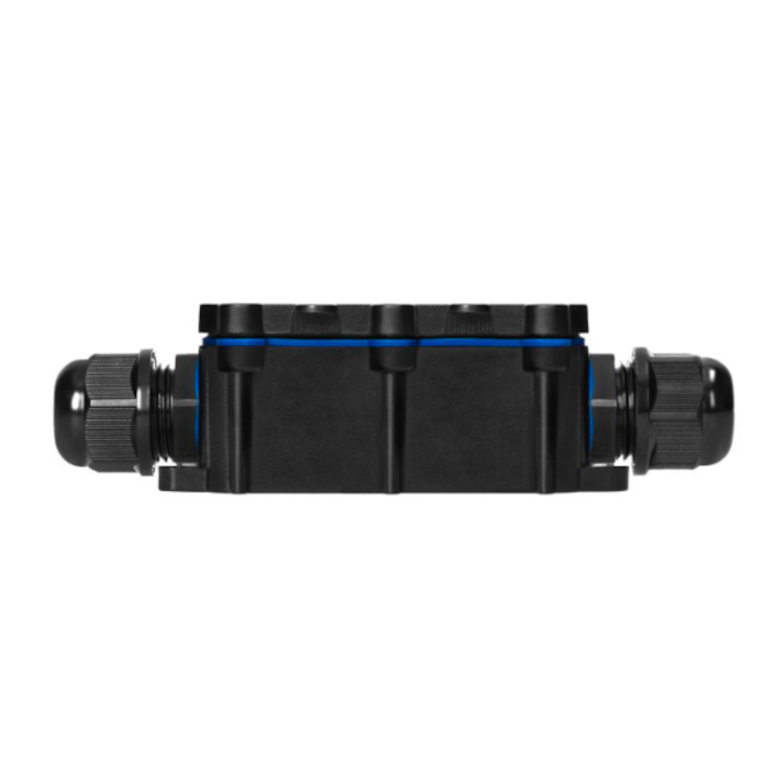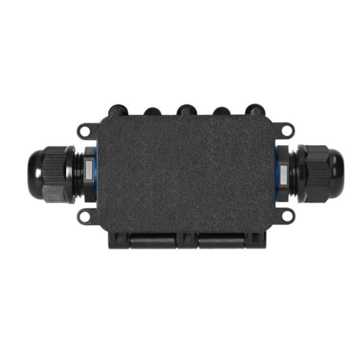 Obudowa z wytrzymałego tworzywa PC/PA66 jest odporna na UV i uszkodzenia mechaniczne (IK09), a stopień ochrony IP68 zapewnia pełną pyłoszczelność i odporność na długotrwałe zanurzenie w wodzie. Puszka posiada dwie dławnice M20 (7–12 mm), szybkozłączkę 1x3 (0,75–4 mm²) oraz złączkę śrubową, co ułatwia szybki i pewny montaż. Możliwy jest także montaż w gruncie.