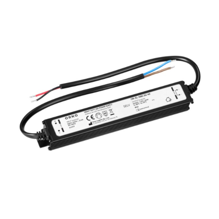 Zasilacz 24 V / 40 W ORNO OR-ZL-1682/24/40 w metalowej obudowie o klasie szczelności IP44 przeznaczony jest do zasilania taśm LED w miejscach, gdzie może występować wilgoć lub zapylenie, np. w kuchni, łazience, garażu czy pod zadaszeniem.